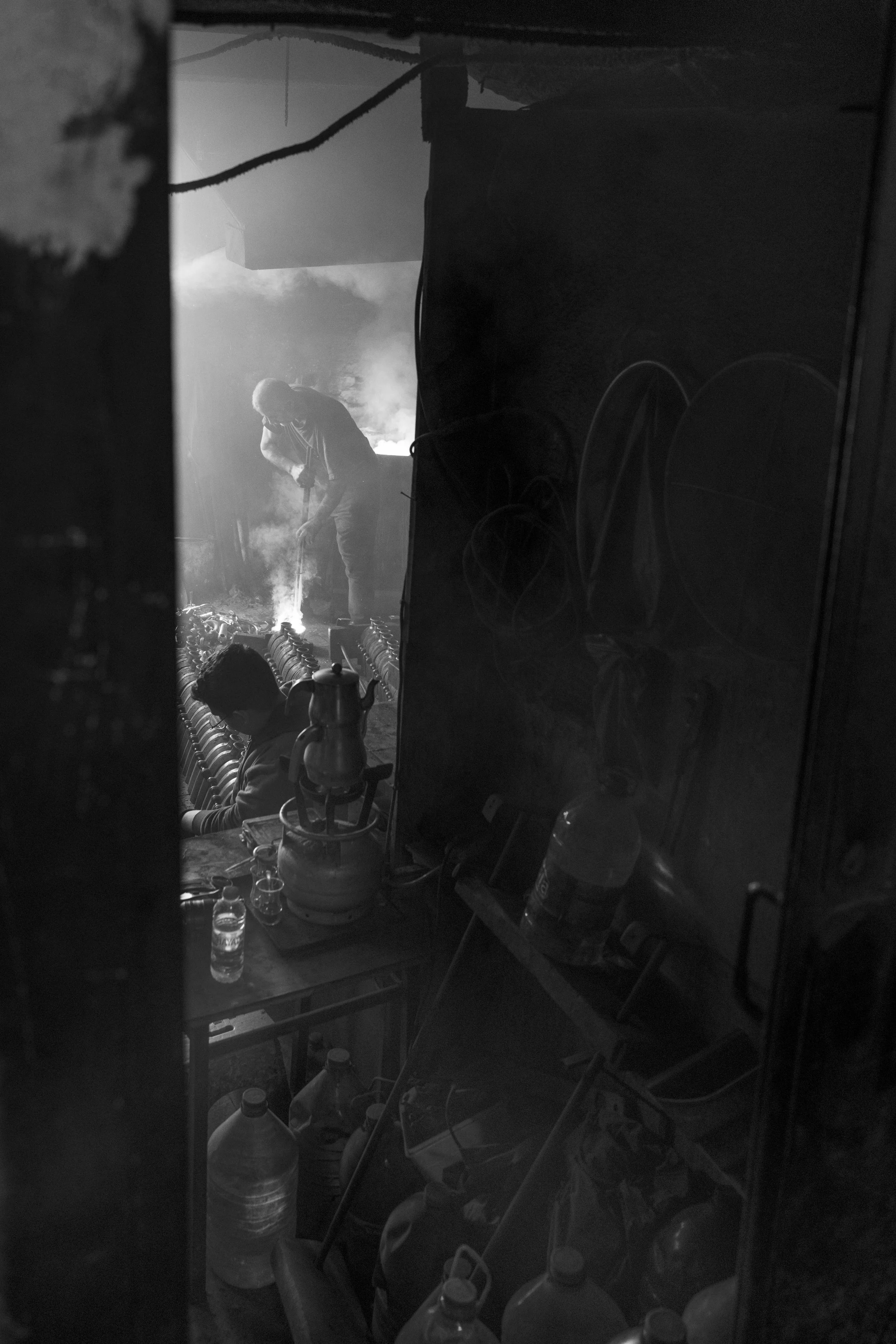 Deep in the ancient “han” network of Istanbul, the air is thick with particles, rising from the furnace like the mushroom cloud of a nuclear explosion. The only source of ventilation is a domestic fan in the window, reminding me of one we had in our family kitchen in the 1970s. My lungs were crying out, my body melting with the heat, Cemal has been working in this environment for over 50 years.